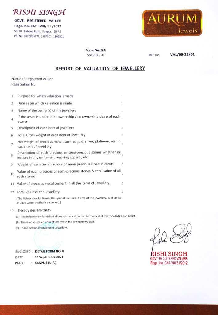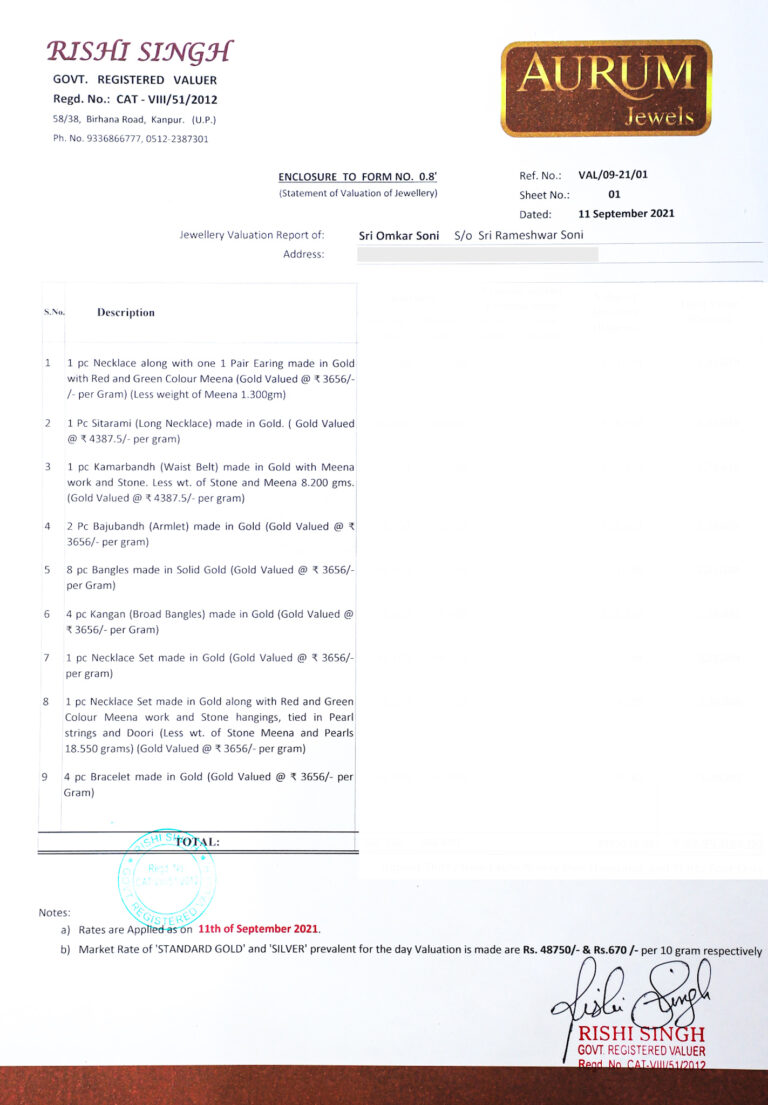 Once the gold Valuation is complete, there are a few things which you should keep a note of. These include the date on which valuation has been made, Description of each item of jewellery, Total gross weight of each item of jewellery, Net weight of Gold, Weight of the studded items, GST rate.